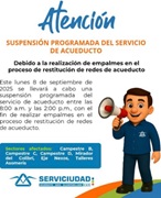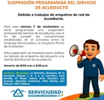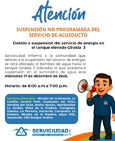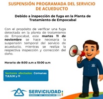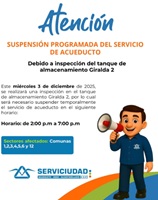 Este miércoles 3 de diciembre, se realizará la inspección del tanque de almacenamiento Giralda 2, por lo que será necesario suspender temporalmente el servicio de acueducto entre las 2:00 p.m. y las 7:00 p.m., informó Serviciudad. La suspensión se aplicará en los barrios correspondientes a las Comunas 1,2,3,4,5,6 y 12 Serviciudad , la empresa prestadora recomendó a la comunidad contar con un tanque de almacenamiento domiciliario,