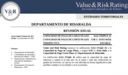 UN AÑO MÁS: GOBERNACIÓN DE RISARALDA MANTIENE LA CALIFICACIÓN TRIPLE AAA EN EL MANEJO DE SUS FINANZAS