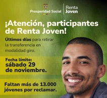 Prosperidad Social anunció que, desde el 12 de noviembre, 170.677 participantes de Renta Joven recibirán la transferencia monetaria correspondiente a un nuevo ciclo del programa. Renta Joven apoya a estudiantes en situación de pobreza y vulnerabilidad para que permanezcan y se gradúen de la educación superior